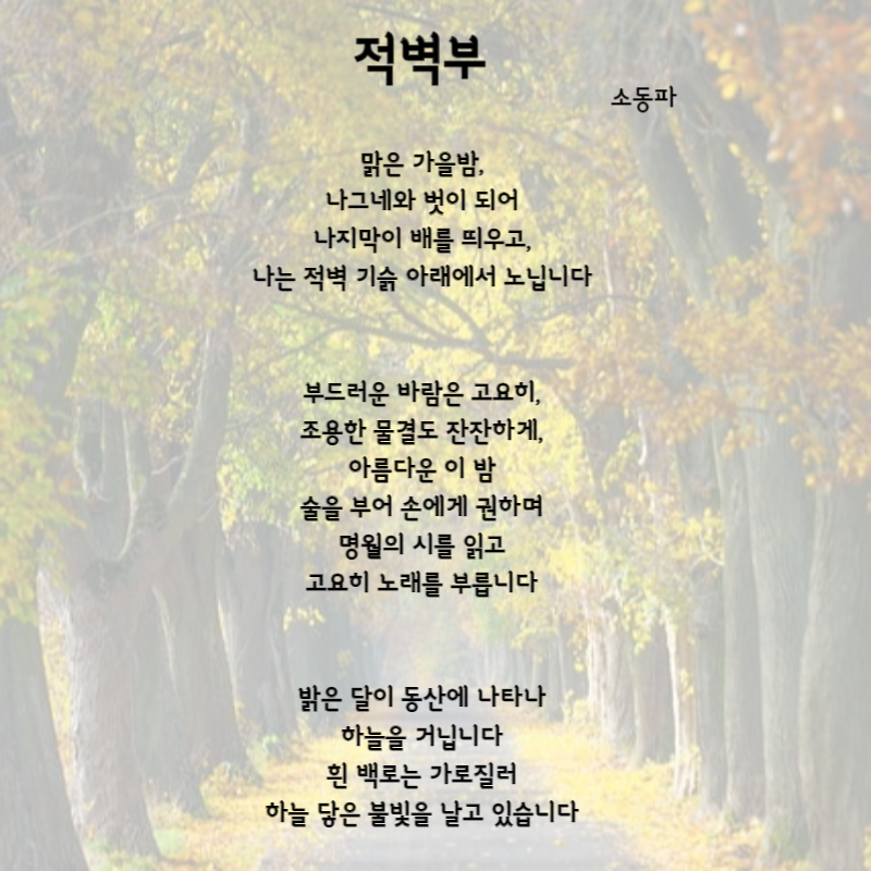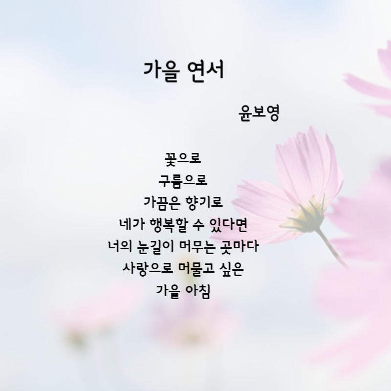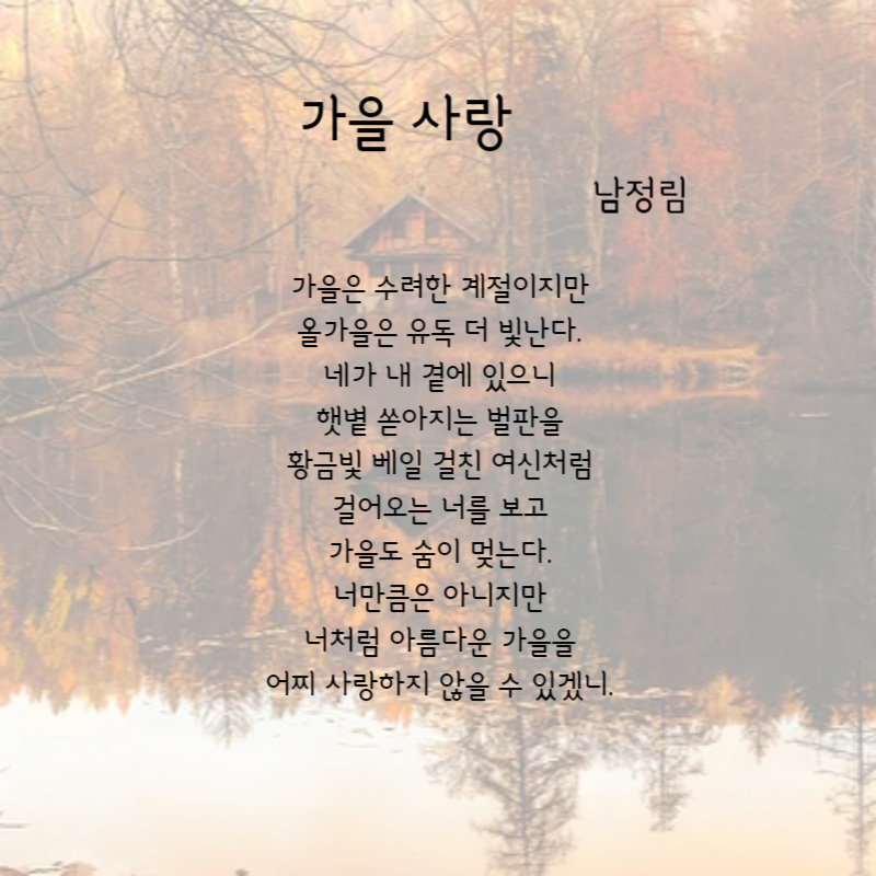 가을은 자연의 아름다운 변화를 볼 수 있으면서 우리의 내면을 되돌아보게 하는 계절인 것 같습니다. 가을의 감성을 담은 시들을 읽어보시고 여유로움과 사색에 잠기는 시간을 가져보시길 바랍니다. 오늘도 힘내시고 좋은 하루 보내세요.